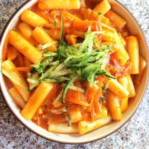 最后,装盘,加点黄瓜丝,更漂亮,也用清淡的生黄瓜平和些年糕的辣,我为了让颜色好看些,就放了三小勺的辣酱,不敢再辣,就没放辣椒粉。很好吃哦!