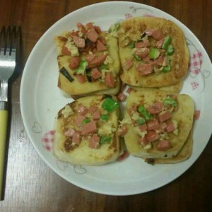 把馒头切成大小适中的馒头片。葱花和火腿肠切好了备用。