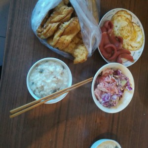 瘦肉切丝,用热水焯一遍,和姜丝食盐放一起腌制(酌情添加酱油或者香油)