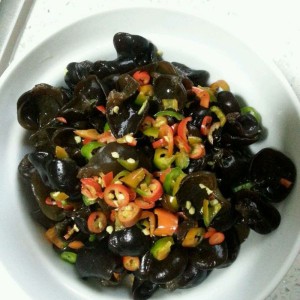 在汆好的木耳里加入小米辣和青椒碎,放入米醋盐鸡精拌匀就好啦