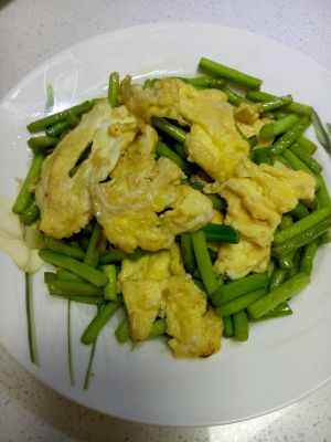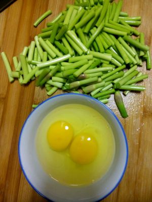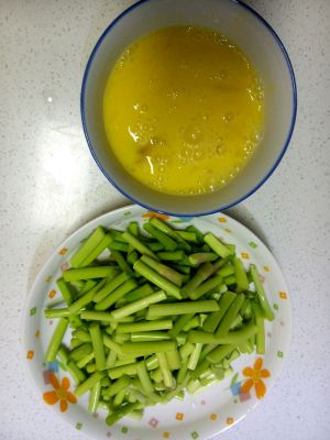 蒜苔去尾洗净切段,鸡蛋打入碗里。