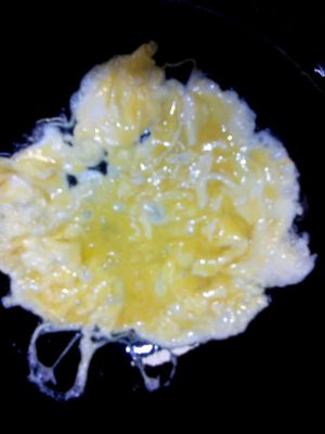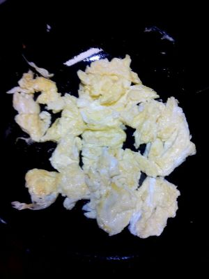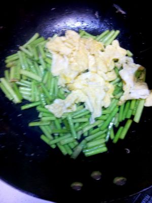 炒到微黄时关火,倒入炒好的鸡蛋翻动两下。