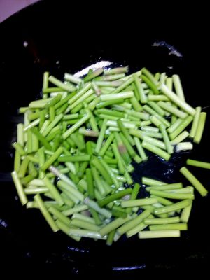 炒锅烧热放底油,油热放入蒜苔段加适量盐翻炒。