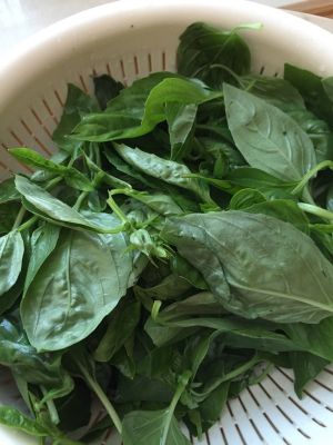 新鲜罗勒洗净,只要叶儿去掉大杆子,晾干或者用纸吸干水。