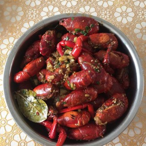 3.香味出来后,把龙虾放下去不停翻炒,等变色后就倒入1/3的啤酒,没过龙虾,然后加入冰糖,八角,桂皮,干辣椒,大火烧开。