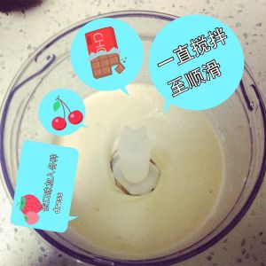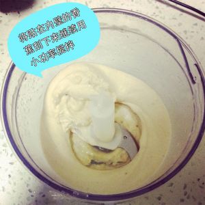 搅拌至渐渐顺滑后,把贴在内壁上的香蕉果肉刮下来继续搅拌。