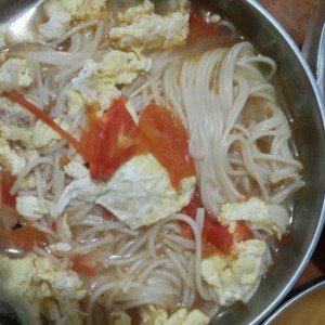 锅中热油把鸡蛋炒熟,铲出,在热油把西红柿炒出水,加入鸡蛋翻炒一下,之后加水,水开放入盐少许,调味,之后放入面条,大约煮个4-5分钟,即可出锅