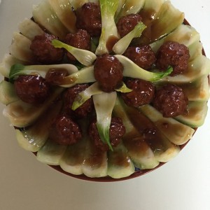 锅中放水,把炸好的肉丸放入,水埋到肉丸三分之二处,加调料酱油,料酒、八角一个、大葱,冰糖用中火焖煮十分钟左右至熟透,最后放味精用淀粉勾芡收汁。(味精在高温下会成生一种物质对身体有一定危害,所以我养成习惯出锅前放味精)