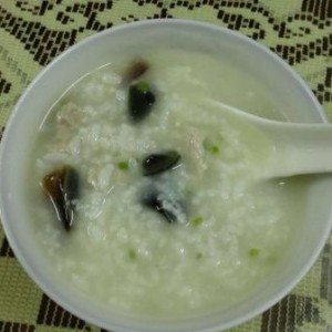 2.大米煮20分钟后放入肉和一半的皮蛋
