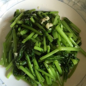 茼蒿颜色变深后,放入蒜末,继续翻炒至闻见蒜香,出锅。