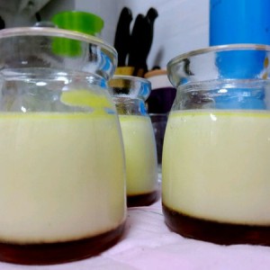 水与80g糖入锅,小火加热,几分钟后糖浆由无色透明变微黄,即刻关火,锅的余温会让糖浆颜色更深的。趁热倒进布丁瓶