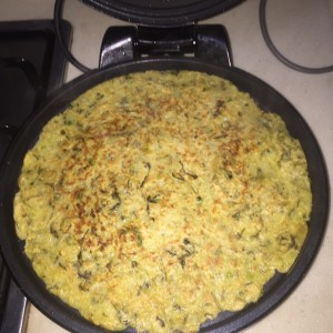 加热饼铛,倒入少量的油,将糊状的材料摊平放入。