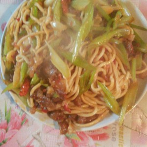 再起一锅,热锅加油,把牛肉煸干,放入干辣椒,葱,蒜,煸香后,放入红油豆瓣酱,再放入芹菜,把面捞出漓干水后放入锅內,加适量的盐,快速翻炒后即可出锅了。