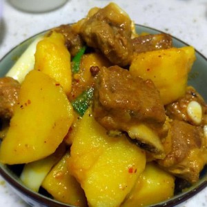 倒入切好的土豆和排骨一起炒三分钟,这个过程中可适当加一点盐,土豆会更入味。