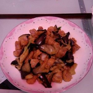 锅内留底油葱花,蒜片爆锅,下肉段快速翻炒加入茄子,放盐出锅。