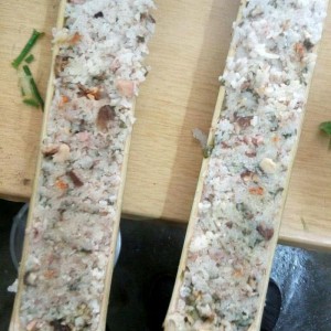 4 全部材料混合在一起后装进竹筒,不要装太满,倒进水浸到米(这个很重要,没水米蒸出来就是干的)
