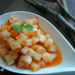 萝卜不带皮的部分用来切成颗状,加入辣椒酱,白糖拌匀,试试味道合适就可以放入密封罐三天以后就可以食用咯,口感十分爽口,实在是年后刮油神食