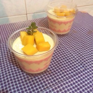用筛网过滤一遍(口感更细腻),装布丁杯,冰箱冷藏凝固,表面装饰芒果粒及薄荷叶点缀