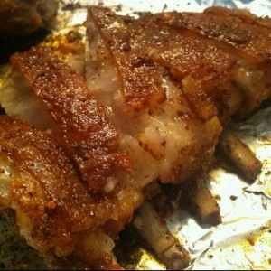 6.外皮烤得焦黄后,出炉。用菜刀顺着排骨一根根切开,开动吧!!