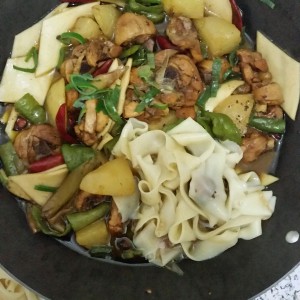 3.倒入鸡肉,葱,蒜苗,蒜瓣,姜片至鸡肉上色