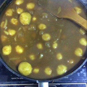 搅拌到咖喱粉和咖喱块融掉 煮20-30分钟 汁变得很浓稠 鱼丸变得能按进去就可以了