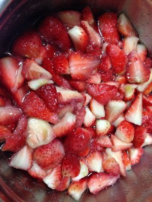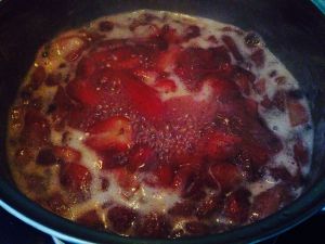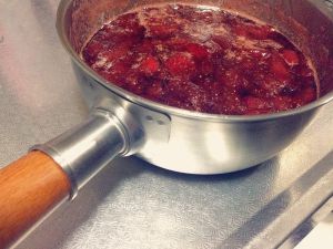 腌好的草莓倒入不锈钢的小锅,小火熬煮,木铲经常搅拌,避免糊底。整个过程中都不要加水,草莓本身含水量大,经过腌制以后会出很多水