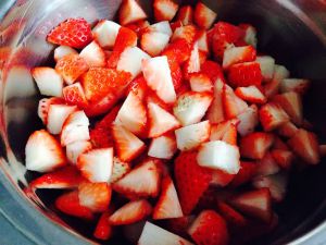 草莓去蒂切块儿,喜欢吃过头丰富的盆友可以切大点块儿,喜欢果泥的可以切碎一点di