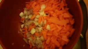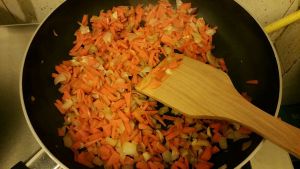 将胡萝卜和洋葱放入锅中煸炒一下,因为胡萝卜和油炒锅,胡罗卜素才能有效发挥作用。