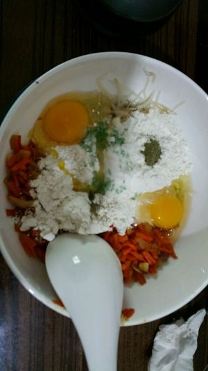 放入所有食材,加入鸡蛋两个,加入面粉三大勺(这里的勺子是大汤勺),再加入盐,花椒油,蔬菜精,黑胡椒,藏香葱末(西藏特有),一点点白糖(用来提鲜)