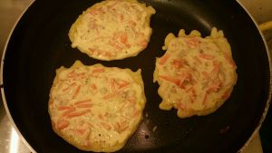 用汤勺,舀三勺放在不粘平底锅三个处,不要一次舀很多,不然过后翻面会很困难。