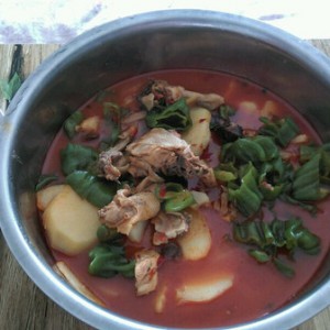 然后加入土豆熬煮。同时,煮水,准备煮面。鸡块已熟,土豆松软后,加入青椒,两分钟后关火即可。