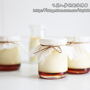 将焦糖酱倒入奶瓶,平铺满底部,放凉备用;