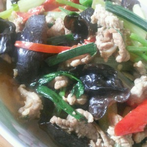 热锅冷油下锅,(油不要放太多了,因为太油了不好吃,)放点盐再放入切好的大蒜瓣,辣椒,翻炒2下,然后放切好的芹菜,木耳,继续翻炒,最后放炒好的了肉,生抽,十三香,大蒜叶,香菜,鸡精粉翻炒2分钟后出锅,
