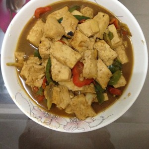 锅里放油,把葱姜蒜一起爆炒,把切好的豆腐放进锅里一起翻炒,再放盐,准备的酱料。添加一些水,小火炖,再放青辣椒,红辣椒,鸡精。然后就好了。简单方便