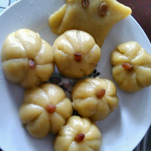 当揉成面团状 扯一小块捏捏试试稀还是干 如果能成型就差不多了 做成南瓜状的在顶上面放粒葡萄干 既美观 吃的时候也酸甜可口(经验来说面团还是干点好 稀了点蒸得就会很软)