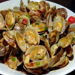 锅内热油,油温七八成热时加入郫县豆瓣酱,等炒出红油后加入姜丝,蒜粒儿,葱花的葱白部分和切好的辣椒翻炒,出香味儿后倒入开口的花蛤继续翻炒