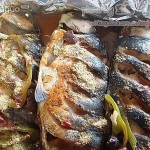 烤盘上铺锡纸,要厚点的锡纸,把鱼放进去,把香菇,葱姜蒜塞进鱼肚子里,鱼身上铺上彩椒,或者洋葱,把2一部分倒进鱼肚子里,其余的倒在鱼身上。
