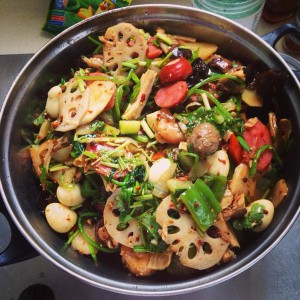 放藕、蘑菇、腐竹、木耳煸炒,再放入麻辣香锅底料炒匀,再放入香肠、鱼丸、鹌鹑蛋、千叶豆腐等,最后放入焯熟的各种蔬菜
