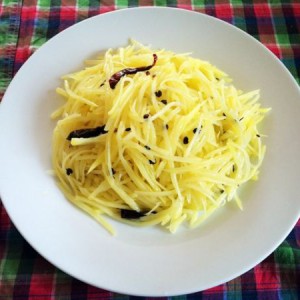 热锅冷油 先放干椒和花椒粒 煸香 倒入土豆丝翻炒 加盐和白醋