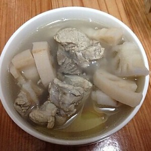 排骨莲藕一起放进去,切几片生姜一起放进去,然后先大火烧开,在小火慢慢煮熟