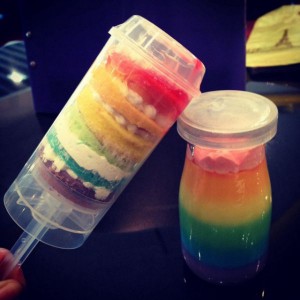 然后将一种颜色加牛奶放入碗里冷冻半小时依次这样就好了(或者一层不加一层加这样口感更好)做完之后你也可以把它捣成小碎块