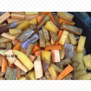 锅内烧油,低温放糖,烧出糖色,放入土豆,胡萝卜翻炒,加少许盐、酱油,翻炒均匀后加水,放入葱姜丝和八角一起煮。