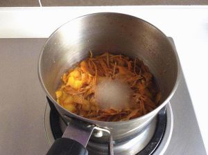橙皮丝放入小锅中,放入能没过橙皮的清水,煮开后煮10分钟,倒掉煮开的水,连煮2次,去掉橙皮的涩味,最后放入一大勺细砂糖,50毫升清水,一直煮到汤汁浓稠,关火待用