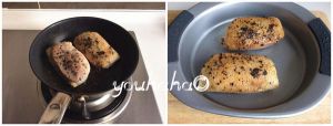 烤箱用上下管同时加热的方式开始预热,温度设定200度; 用中火烧热平底锅,放入适量的植物油,放入腌渍后的鸭胸肉,煎至2面变黄;盛出鸭胸肉放入烤盘中,