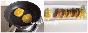 切片的橙子在平底锅中稍微一煎,也可以不用煎,摆盘的时候,一片鸭肉一片橙子摆放在盘中,苦菊做装饰,浇上第9步的汤汁,上面用一枝百里香装饰一下,就OK