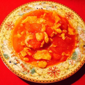 鸡蛋盛出后直接放入西红柿煸炒,随后放入糖、番茄沙司、盐调味。