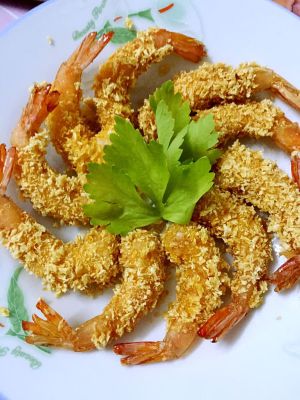 然后拿了虾先粘面粉在粘鸡蛋最后粘面包糠下锅炸至金黄色