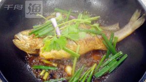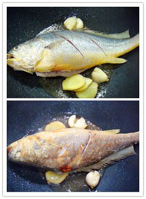 热油锅中爆香姜片、蒜粒,投入鱼,煎制两面金黄。