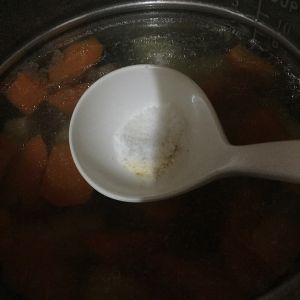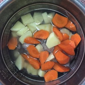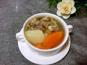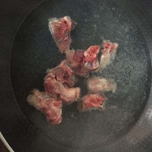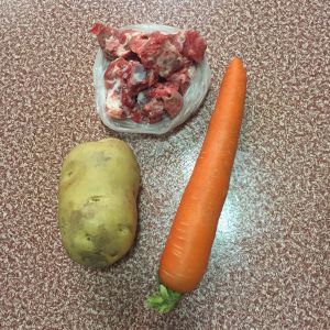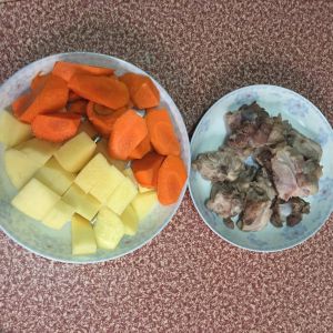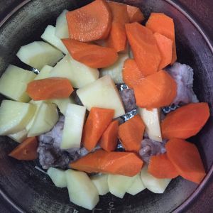 龙骨焯水后捞出洗净备用,土豆,胡萝卜去皮洗净切块
