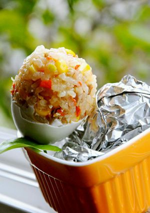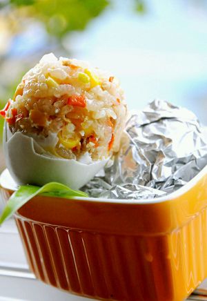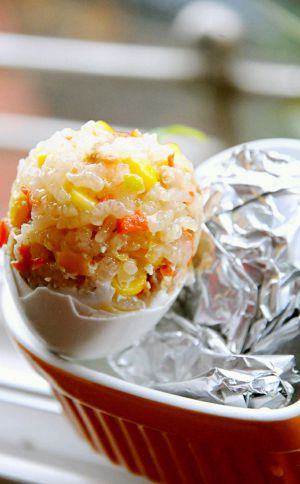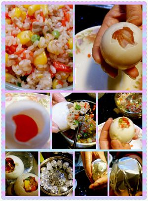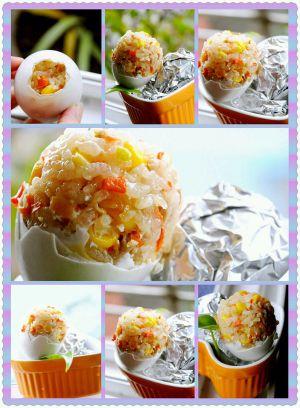 生咸鸭蛋用勺子在鸭蛋大的一头轻轻敲开一个小口,倒出蛋液只留蛋黄,用小勺子把炒了一下的糯米肉粒加入蛋壳中,差不多装平就行了,太满的话到时蒸熟后会溢出,用锡箔纸把蛋裹住,放入锅中隔水蒸1小时左右(如果喜欢吃硬一点的话,蒸的时间就短些,大约40分钟左右就可以了),蒸熟后就可以美美的吃啦,下次吃的时候隔水加热即可。